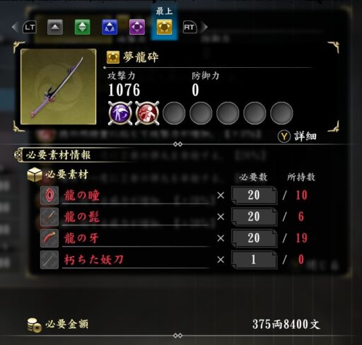 しかし「真田信康を倒せ」加護の角印がついた天龍印をドロップする可能性もある上、賞金が1回で20両もくれるので素材集めのために周回しているとお金もいつの間にか何千両となっているので美味しくはあります。ちなみに余談ですが、維新では真田家ではなく豊臣家でした。なぜ変えたのかはわかりません。更に余談ですが上記の夢龍砕は維新では刀を振ると衝撃波のような物が飛んで離れた敵にも攻撃が当たる鬼強の妖刀でしたが、極では弱体化されてただの妖刀に成り下がってしまいました。正直今作では鬼神丸国重や布都御魂やソハヤノツルギのほうが強い気がします。