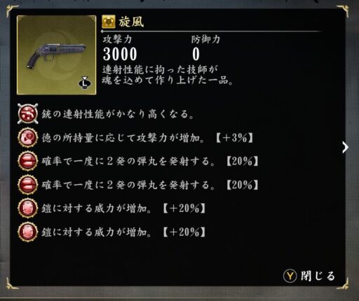 • 肝心の銃ですが【旋風】が一番オススメです。固有印の閃射が強過ぎて一度使ってしまうと他の銃はもう使えないかもしれません。