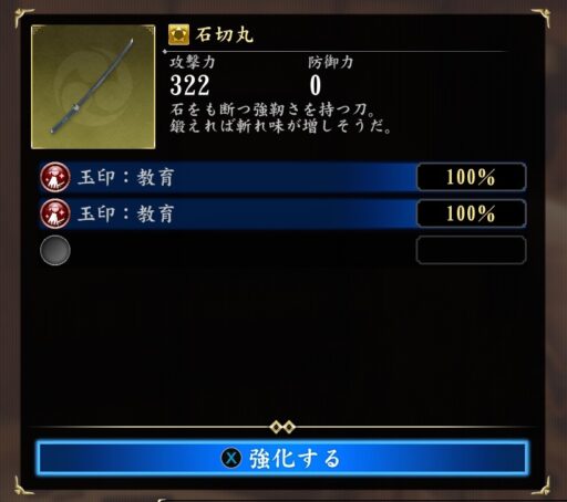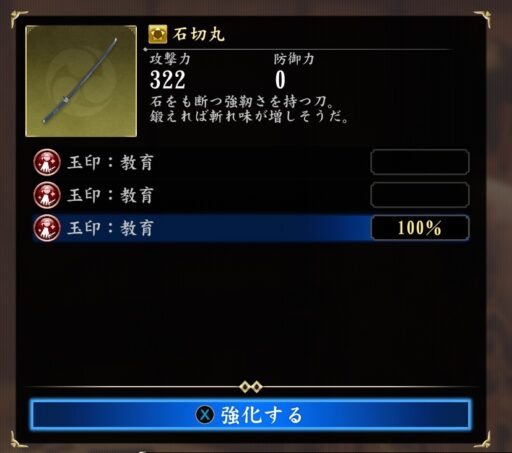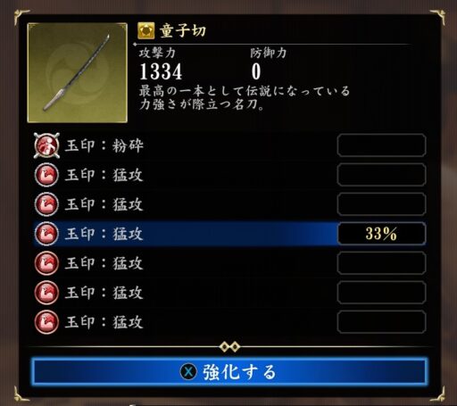 武具強化とは武具に印をはめ込んで様々な効果を得た武具を作ることです。何度かやったことがる方はお気づきかもしれませんが、印をつける際の%は確率じゃないと。例えば98%の印をつけようとして失敗したとして、ロードして何回かやってみても絶対につかないのです。あの%は格というかランクというかそういったものになってます。100%=Gランクみたいな感じで%が下がるとランクが上がっていくと考えてください。当然ランクが上がると付きにくくなります。最大で18%でしょうか、改心や加護や猛攻などを金にする時に出現します。そして印がつくかどうかはテーブルで管理されています。100%であれば何も考えなくても確実につきますが、印を無駄にしないためにもテーブルを動かして印を付ける必要があります。その方法をご紹介します。