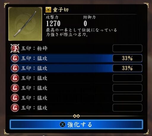 また改心や加護よりも手に入りやすいと思われる【猛攻】は改心や加護と確率が同じなので調べる用に銅の猛攻が複数ついた武器と銀の猛攻が複数ついた武器などを作っておくと調べられる量が増えるので時短にはなるかも